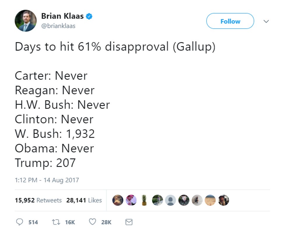 Trump's disapproval in this latest poll, which was taken August 11-13 (so that includes two days of Charlottesville), is 61%, which is the exact same as Quinnipiac showed a couple weeks ago.
