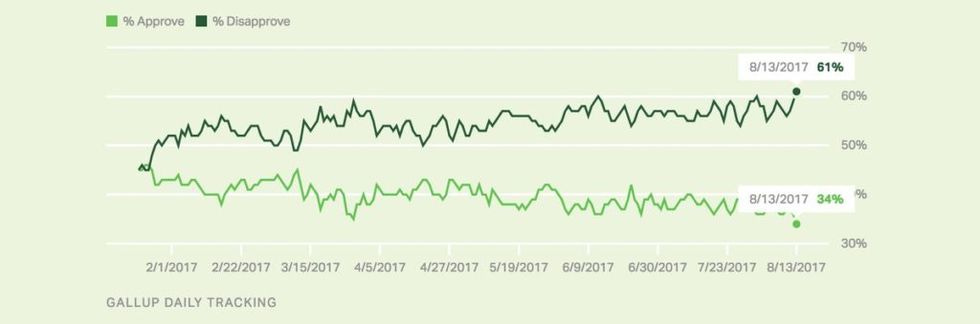 Gallup notes that Trump's numbers were already looking godawful during the Friday portion of this poll, so EVEN IF Charlottesville hadn't happened yet, it's POSSIBLE that a lot of the folks they talked to also unfairly disapproved of how Trump spent the week trying to macho dick us into nuclear war with North Korea, all while he was beached at Bedminster on his "working stay-cation." We just don't know.
