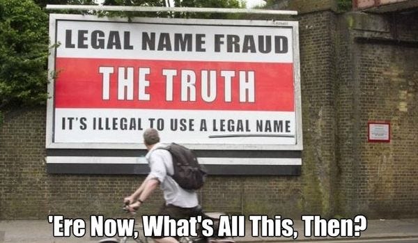 That brilliant wordplay certainly seems consistent with the postmodern insights into legal name fraud on the blog post, which explains (for a certain value of the word "explains"):