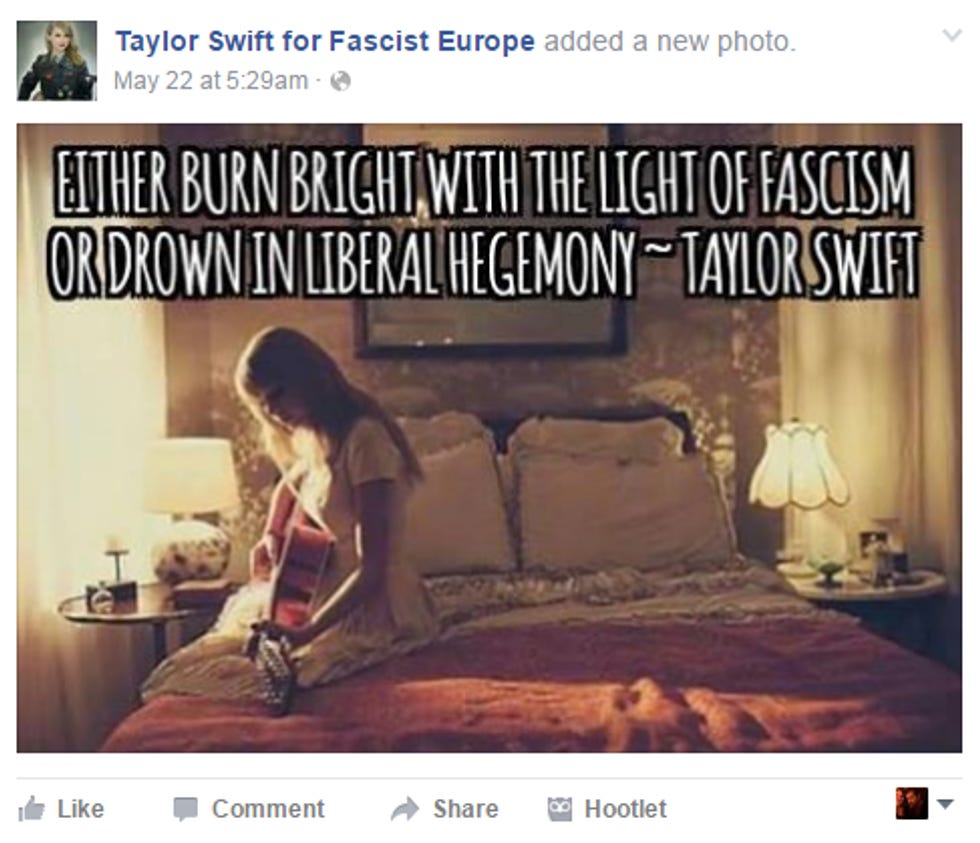 [T]here is the 16,000-strong “Taylor Swift for Fascist Europe” Facebook group, previously banned by Facebook but up again.