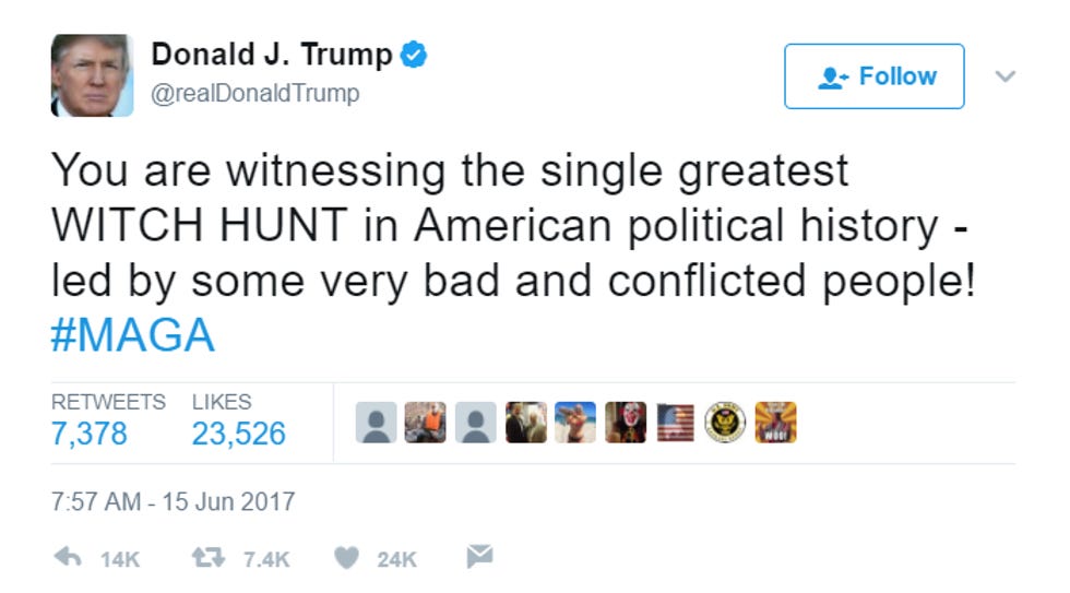 Aw puddin'! Nobody said the collusion investigation was over! It's just getting started, and many people may yet die in jail for it! Anyway, you were talking about "bad and conflicted people," Mr. President?