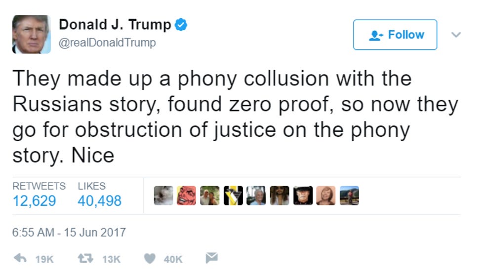 Couple things: 1) The WaPo gives no indication the "leak" came from the FBI, and 2) though Mueller is keeping his investigation close to his vest, it's not like some sort of top secret code word clearance information that Trump may have committed obstruction of justice. He did it in front of all our fucking faces. Where's the "illegal" leak? Otherwise, good lawyer statement that doesn't even remotely try to assert the president's innocence!