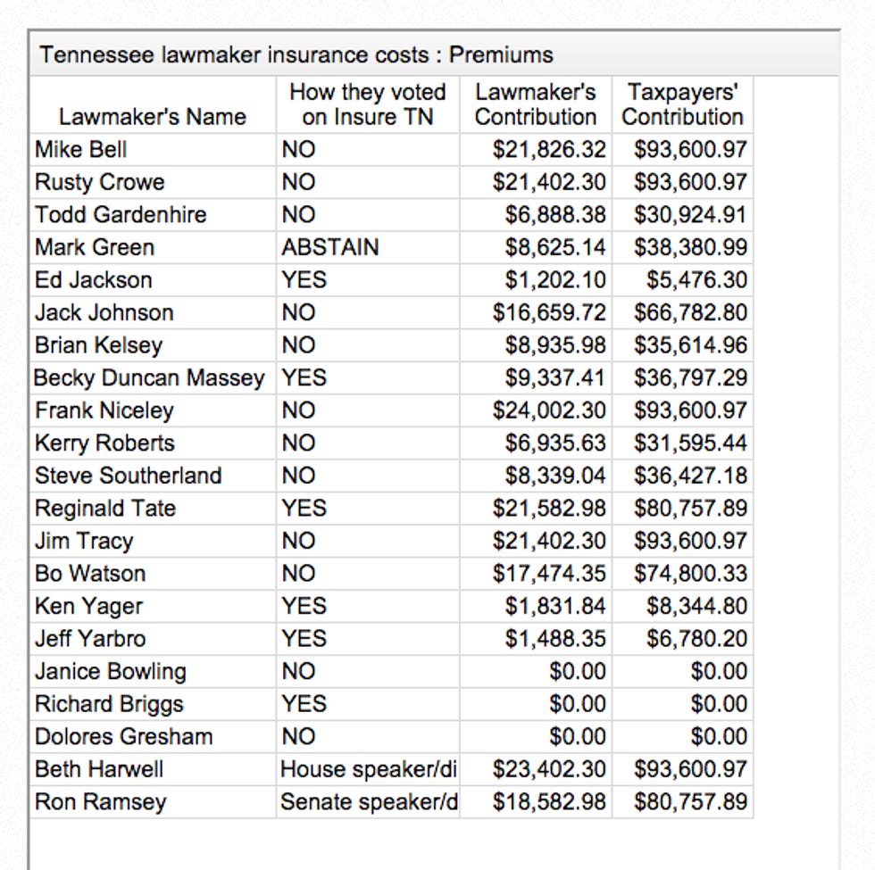 "These numbers reveal a stunning hypocrisy," said Walter Davis, executive director of the Tennessee Health Care Campaign. "The loudest opponents of a legislative debate on Insure Tennessee receive as much as $93,600 in premium support for their health insurance."