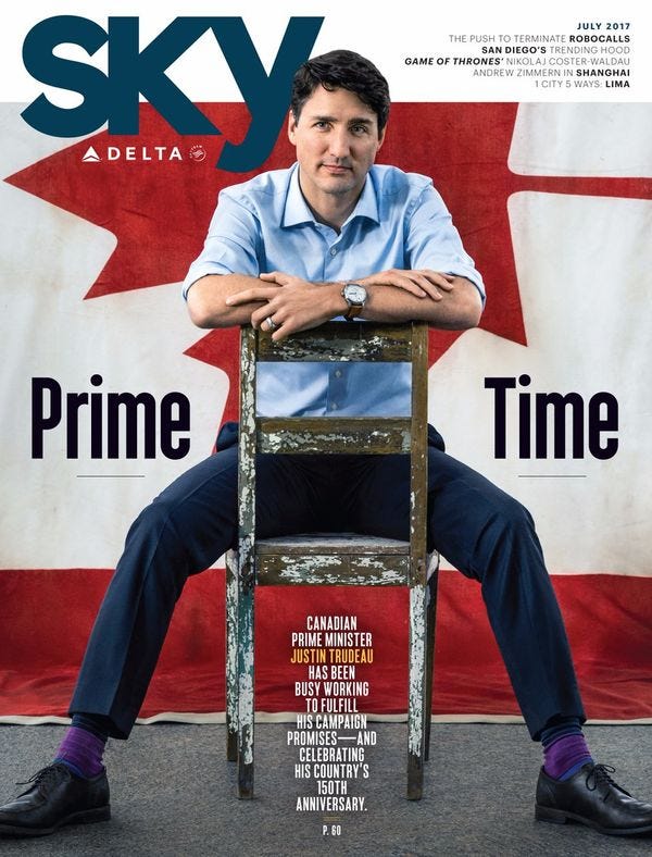 Anyway, here is your picture of Justin Trudeau spreading his legs on the cover of Sky , the in-flight magazine of Delta Airlines: