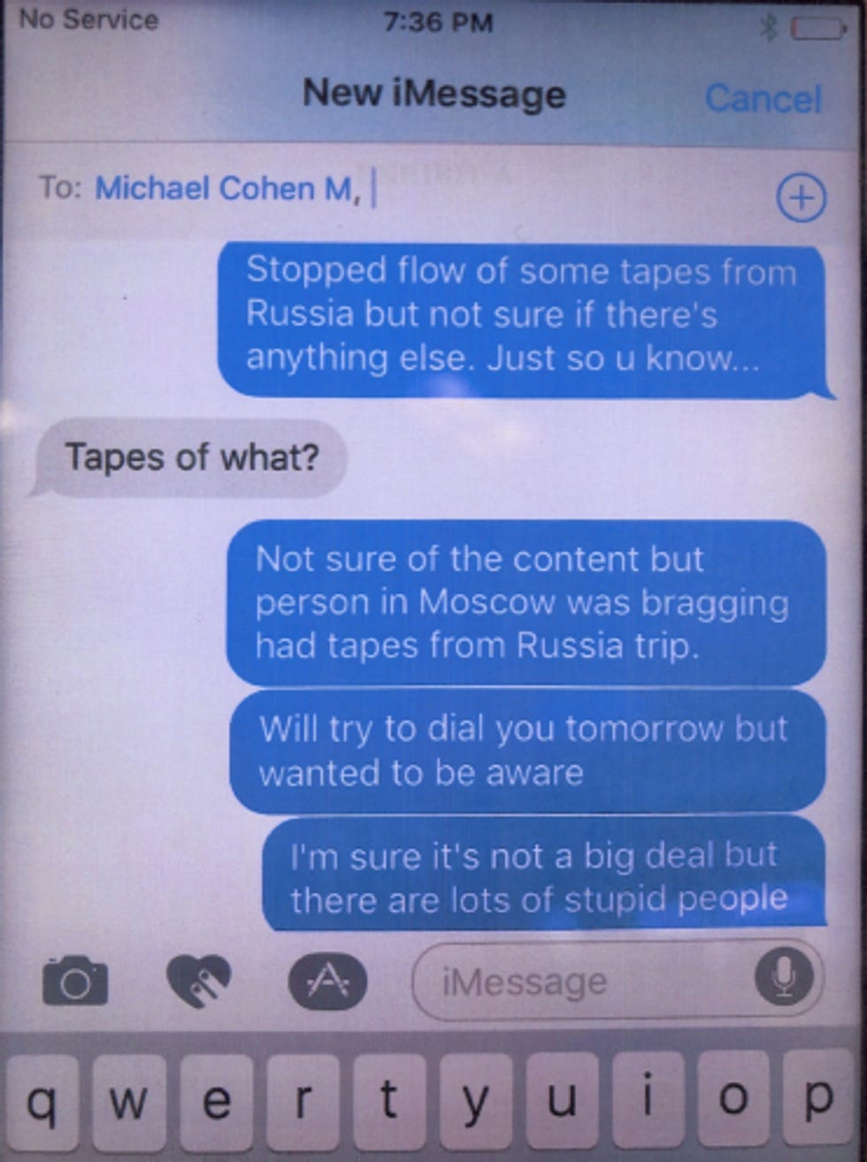 So on October 30, 2016, MICHAEL COHEN got a text from a Russian, Giorgi Rtskhiladze, who told him he "stopped flow" (LOL) of tapes from Russia. Rtskhiladze said rumor was people associated with the CROCUS GROUP had the tapes. CROCUS GROUP is the Agalarovs, Trump's longtime buddies who threw the pageant with him. (Kinda makes you see that music video Emin Agalarov did about the pee tape in a different light, don't it? A yellower light.) COHEN talked to TRUMP about it. RTSKHILADZE said he heard they were fake tapes, but he didn't tell COHEN that.