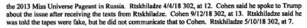 The big reveal in the next text is that Rtskhiladze was "not sure of the content," but that "person in Moscow was bragging had tapes from Russia trip." Which ... would seem to square exactly with Mueller's footnote, IF YOU READ THE WHOLE THING, especially the last sentence where Mueller reports on his own interview with Rtskhiladze, who said he "was told the tapes were fake," but didn't tell Michael Cohen that for some reason . Anyone with an ounce of reading comprehension skills would naturally infer that meant Rstkhiladze hadn't actually seen the alleged tapes.
