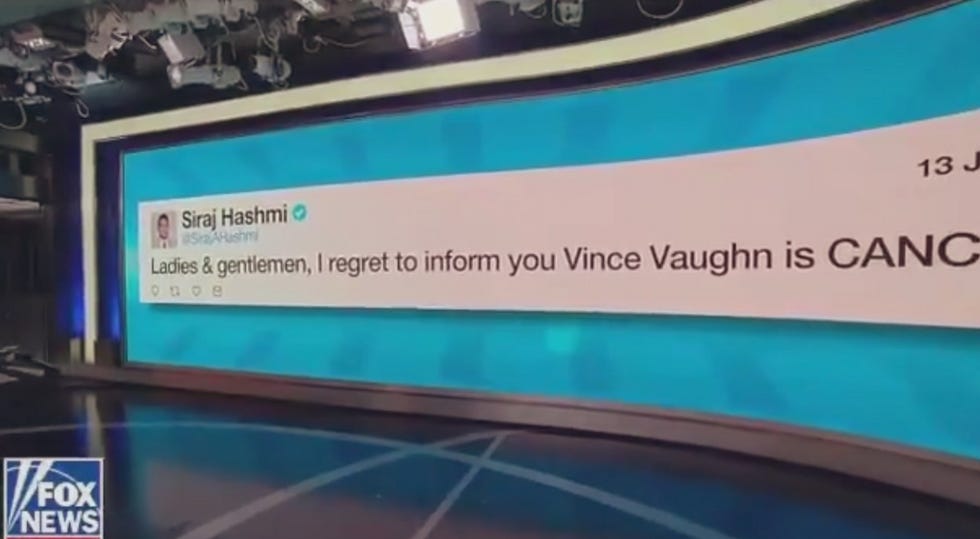 The gang at Fox even managed to find an obviously serious tweet from noted liberal (except not) Siraj Hasmi declaring poor Vince Vaughn canceled forever.