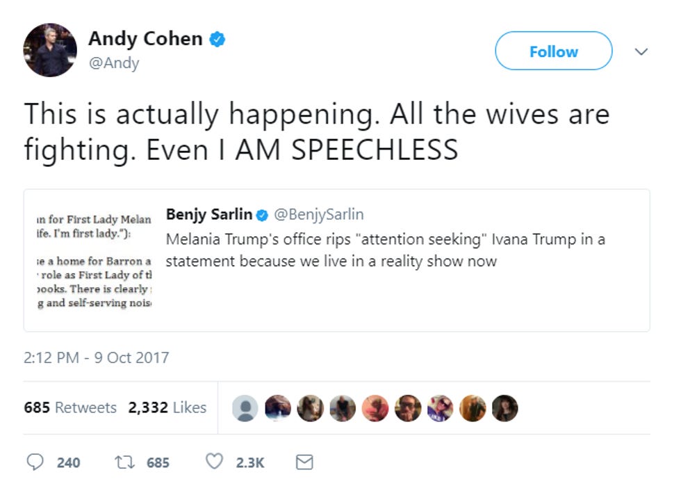 Anyway, Trump must have heard Bob Corker say he was running the Oval like it was "The Apprentice," and think, "Yeah watch this, buddy, I'll see your 'Apprentice' and raise you 'Real Housewives,' and I won't even pay Andy Cohen royalties, because I am a dumb cock who doesn't pay my bills." Then he called Ivana like, "Say some shit and make Melania mad. Try to start a fight with Marla too!" ( She did. )