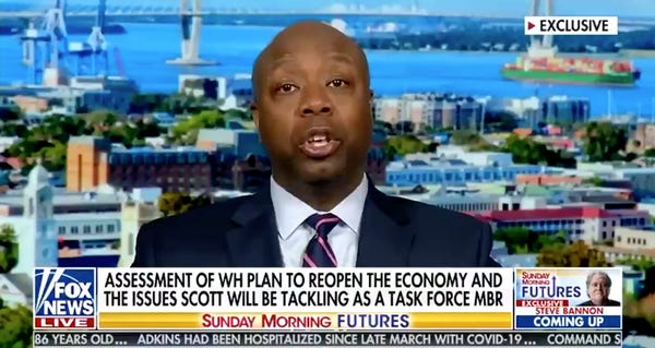 Last week, Tim Scott, the least repulsive but still bad United States senator from South Carolina, joined Donald Trump's half-assed "Opening Up America Again" task force, a group that includes every Republican senator except for Mitt Romney. Scott seems pleased with this dubious honor.