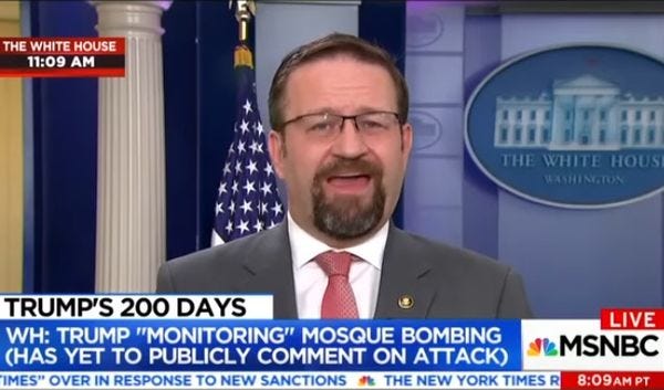 Happily, Trump spokesNazi Sebastian Gorka took to MSNBC to offer a perfectly reasonable explanation for the White House's silence on the Minnesota bombing. Trump is simply being prudent and waiting until all the facts are in, because you never know, maybe liberals bombed the mosque to blame it on rightwingers: