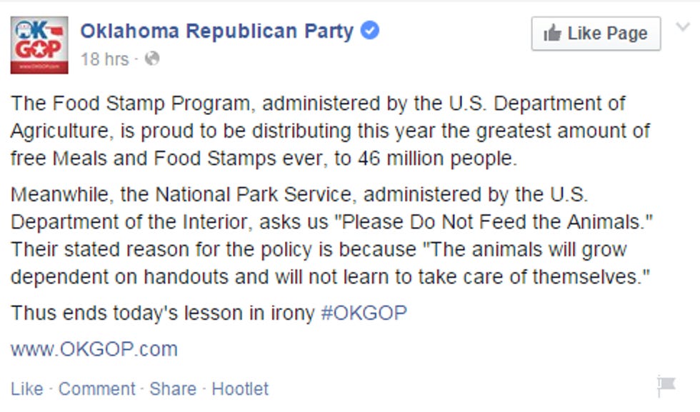 It's tough to be a Republican these days if you don't have an overwhelming disdain for people who struggle to get by (often because they're held back by Republican policies, funny how that works). Because THOSE PEOPLE, right? Anyway, all Republicans know that if people are poor, it's their fault -- unless the poors are Republicans, in which case they are "going through a thing" which is "not at all like those welfare queens" -- so it was perfectly natural for the Oklahoma GOP to post this to its FacePlace page: