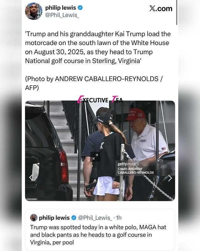 Finally, on Saturday, “a photo surfaced” of Trump with his granddaughter Kai, on their way to go golfing. The New York Post, having noted all of our “dashed hopes,” discreetly did not print it, since the president (who is Trump! does anybody know how that happened???) looked like warmed-over deathshit.