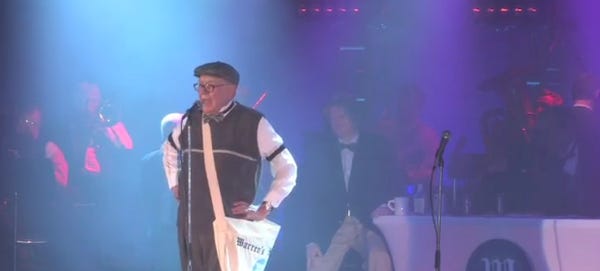 It is official. Warren Buffett, the Sage of Omaha, class warrior, and by all appearances victim of Stage Four of Lesbian Bed Death, will now use his "fuck-you" money to buy a slot and make you listen to him singing whenever and wherever he wants. He has appeared with a ukelele for the Chinese New Year, and in his latest bid for the lights of Broadway, in a newsboy's cap from the 1930s, when he was 47 years old. See him crackle and warble -- charmingly! unbearably! depending upon your affection or lack thereof for the crusty tycoon -- a "funny" song about how he now owns a newspaper, the medium of the future (just ask Rupert Murdoch)!