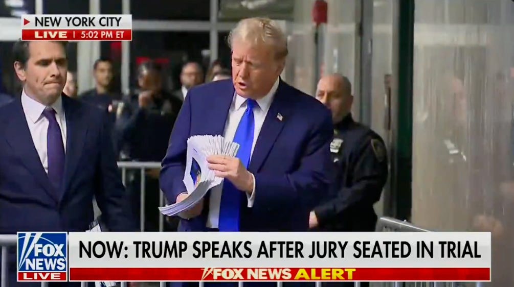 He just keeps flipping through the papers. Nobody can see the papers. He semi-babbles words from them. “Here’s another one! The case is a ridiculous Trump indictment. It’s missing fraud, there’s no fraud! All of these stories are stories of how, and these are done by the experts, and editorials, Bragg falsified business record, and uh, he falsifies them, he’s the one! He’s the fraud. Take a look at all of these are stories, you see them here.” Etc.