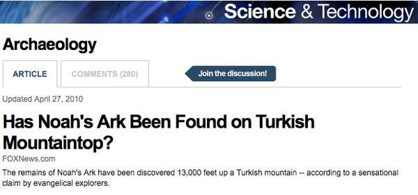 Major Scoop, for those of us who browse the FoxNews.com Science & Technology section's Archaeology subsection all day every day: some Mexicans found some wood on a mountain, and it is Noah's boat, the end.