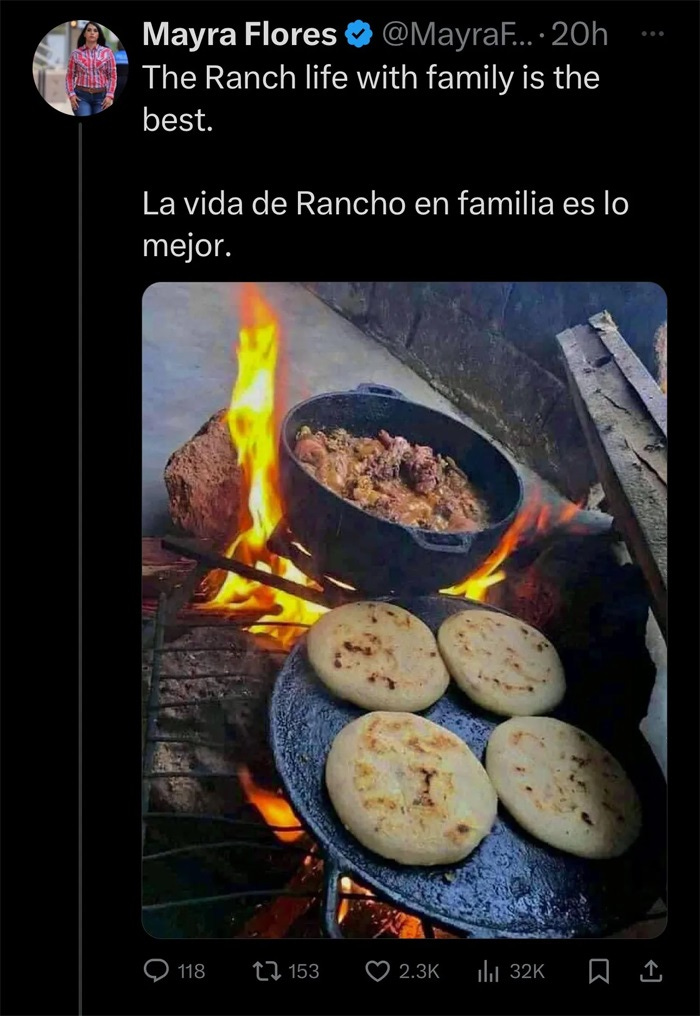 The phrasing of the captions in Flores’s posts certainly imply the food is her own creation, just down-home good Mexican food from a very authentic Texas Republican. Example: this yummy-looking dish in a photo with the caption “The Ranch Life with family is the best.” Someone in the replies asked her if the flatbread was pupusa (from El Salvador or Honduras), but she replied “No, Gorditas de masa.”