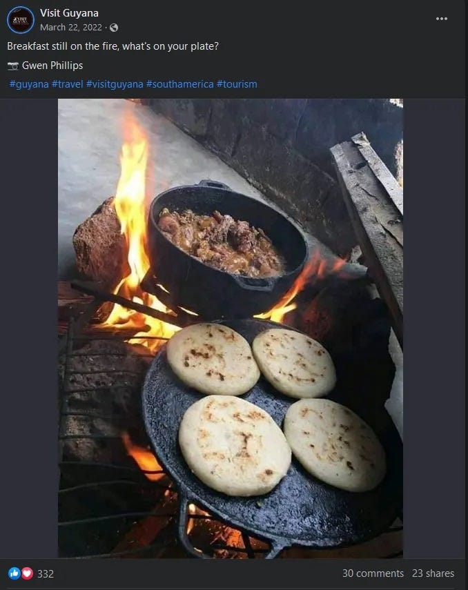 But as social media food sleuths revealed, the “ranch” in the photo isn’t in Texas, or even the USA! The photo is from a Facebook page called “visit Guyana,” where maybe ranch life is the best, but it ain’t the former congresswoman’s. As Current Revolt points out, “The meal in the photo is not even Mexican food, it’s a Guyanese dish likely of stew with sada roti. Guyanese people are not even considered Latino.”