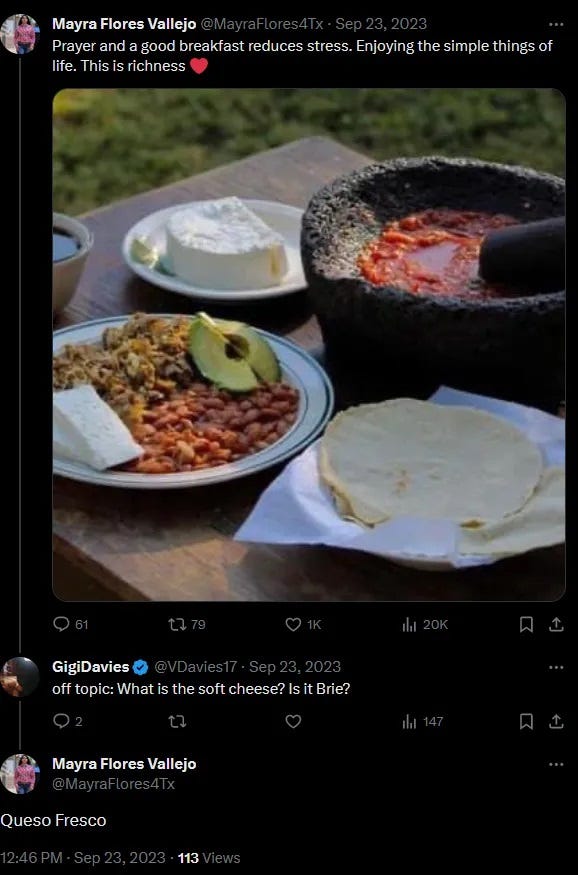 She captioned a post from September with “Prayer and a good breakfast reduces stress. Enjoying the simple things of life [heart emoji],” and was even happy to explain what kind of cheese was in the photo — queso fresco, not brie — implying again that she knew first-hand, from making the food. Of course, that image was also from Facebook, back in 2021. It’s unclear whether her morning prayers came from there, too, or if perhaps the Almighty heard Flores’s prayer and blessed whoever originally cooked the food and took the photo.