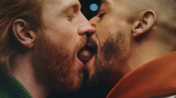 ... best describes the ad this way: "It's like Disney's 'Lady and the Tramp' scene where the two dogs share spaghetti. Except, it's two grown men spinning around in a circle and sharing a creme-filled chocolate egg in a sexualized way."