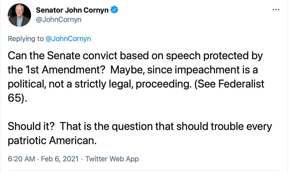 Cornyn does concede, however, that impeachment means whatever 67 senators say it means, but that apparently deeply concerns him.