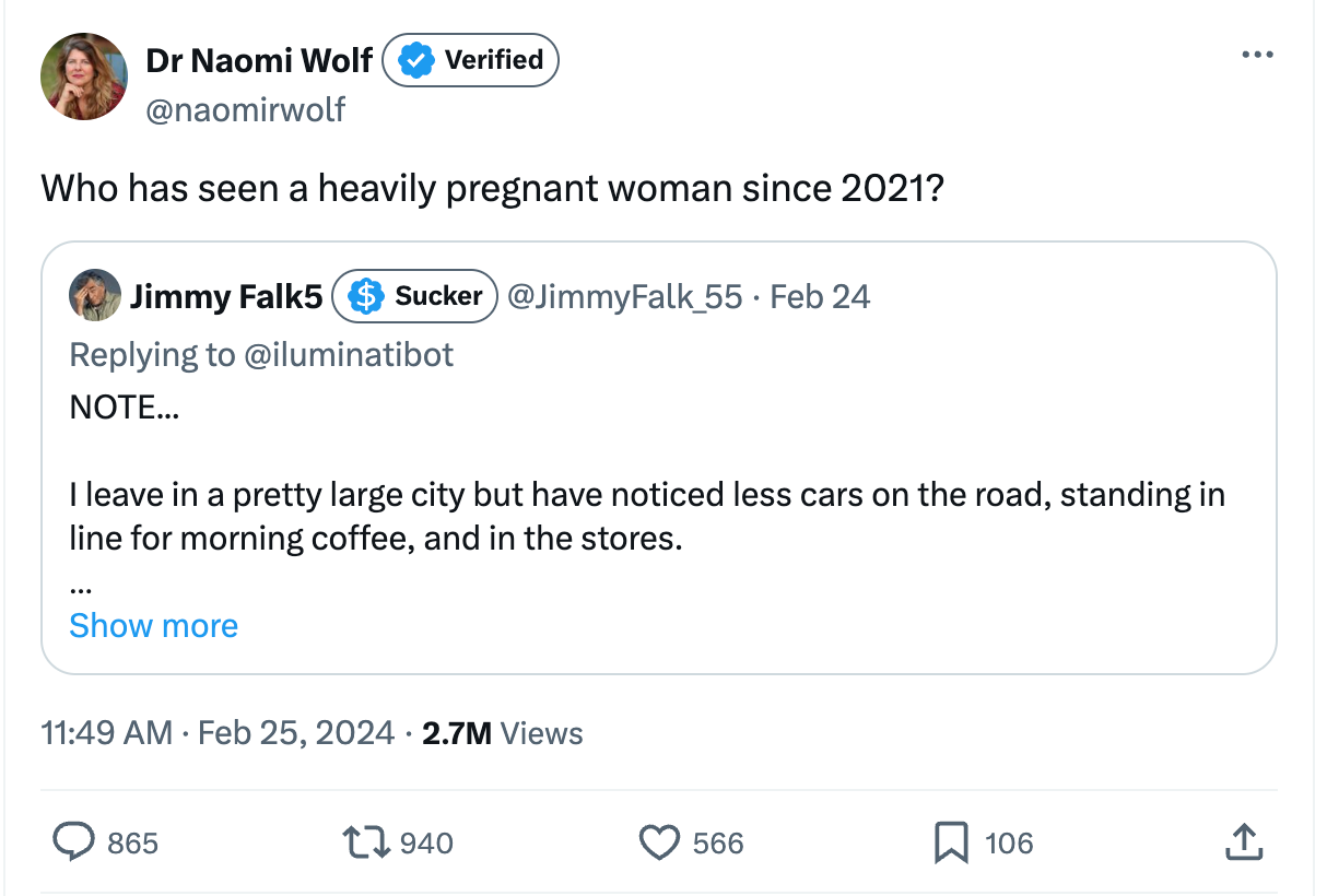 “Who has seen a heavily pregnant woman since 2021?” Wolf asked, ever so plaintively, on social media. The implication, of course, was that this had been caused by the COVID vaccine.