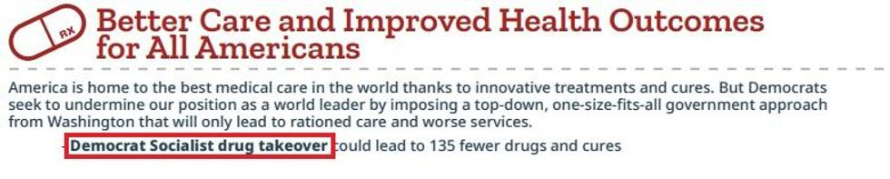 So much nicer! Now instead of "Democrat socialist drug takeover" it's now a kinder, gentler warning that "The Democrats' drug takeover scheme could lead to 135 fewer lifesaving treatments and cures" — although that claim doesn't appear to be explained anywhere. Again, Pelosi's site takes the opportunity to point out that in budget proposals, House Republicans have gone even farther, threatening to privatize Social Security and Medicare, because it's their nature, you see. When Republicans say they want to "Save and strengthen Social Security and Medicare," that usually translates to privatization.