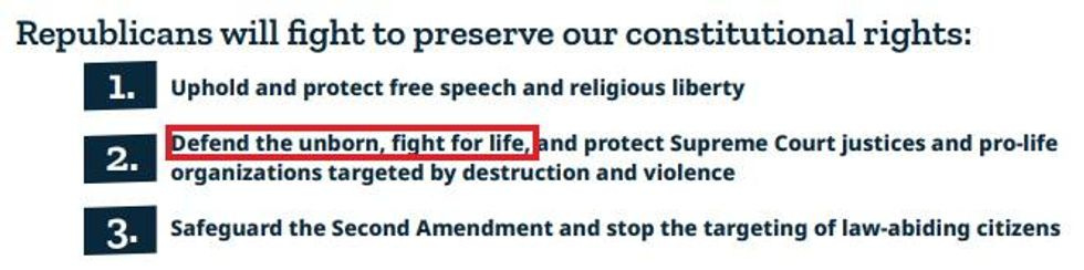 The second has been pared back considerably! Here's the original version, promising that Republicans will "Defend the unborn, fight for life, and protect Supreme Court Justices and pro-life organizations targeted by destruction and violence."