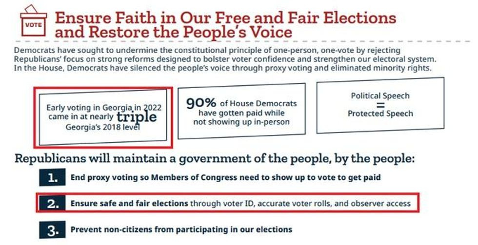 The updated version gets rid of that text box, and also drops the scary bit about noncitizens voting, but it keeps the pledge to continue pushing to "increase accountability in the election process through voter ID, accurate voter rolls, and observer access" — in other words, more voter suppression — and demanding "State sovereignty" in election rules, which of course means opposing the Freedom to Vote Act and and the John Lewis Voting Rights Act , which would standardize voting rules for federal elections nationwide and make sure voting changes don't discriminate.
