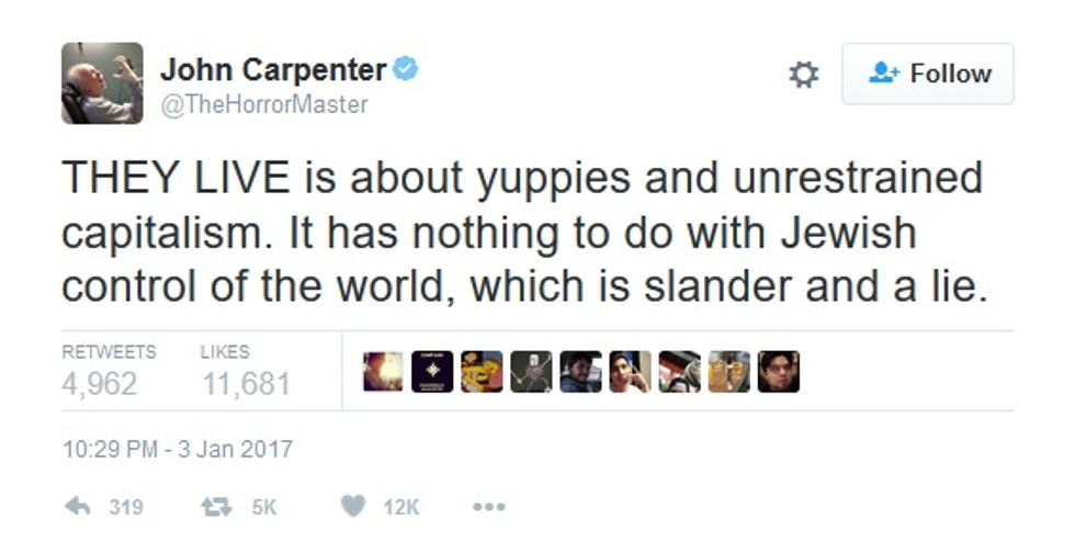We learn so many fascinating things from whacked out neo-Nazis. Like how the Holocaust was completely faked, for instance, even though the Jews totally deserved it. Or how all of history has been manipulated by a tiny cabal of Jewish financiers (who helped pay to fake the Holocaust, maybe?) And then there's this relatively new idea, that John Carpenter's 1988 science fiction/horror film They Live is actually an allegory about how brave Aryans, enslaved by the International Jewish Conspiracy, can free their minds and fight the power! We'd never heard that one until Carpenter Tweeted about it Wednesday: