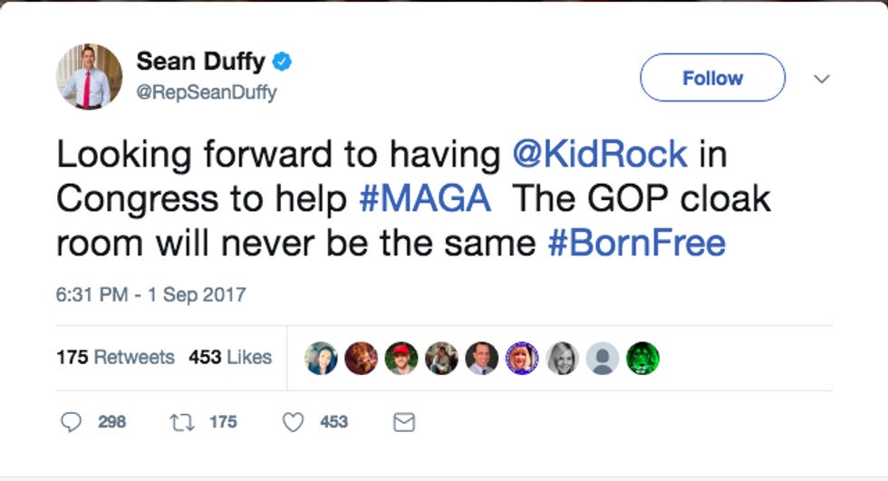 I mean, just take a moment right now and appreciate the full absurdity of this tweet right here. A tweet in which Sean Duffy, a former Real World cast member, announces that he is excited for Kid Rock to also come to congress, so that they can join together to bring PRESIDENT DONALD TRUMP'S vision for America to life: