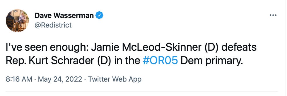 It’s official … kinda. Rep. Kurt Schrader from Oregon has lost his Democratic primary race against challenger Jamie McLeod-Skinner. The votes still aren’t fully counted, but Cook Political Report’s Dave Wasserman finally saw enough Tuesday morning:
