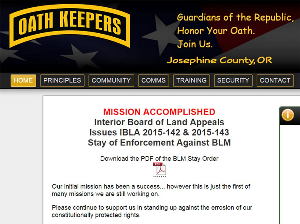 Mary Emerick, spokeswoman for the Josephine County Oath Keepers, told Talking Points Memo that the group was already in the process of "standing down" -- gotta use military terms to prove that you're legit -- and that it was now safe for the brave freedom fighters from outside Oregon to head home: "We’re pretty much downgrading our operation, although we’re a local group so we’ll still be in the area even if we move out of that site for now." She added that the group also would be intervening in some "pretty remarkable" disputes that other local property owners had with the BLM, although she didn't elaborate on the exact nature of those intolerable acts of tyranny. Probably because of the need to keep OpSec, you know.