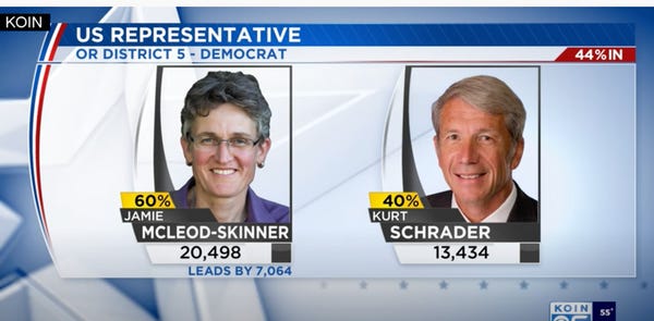 The news from Oregon got even better, as it looks like progressive challenger Jamie McLeod-Skinner is close to ousting incumbent Democratic Rep. Kurt Schrader, who’s known around these parts as the Joe Manchin of Oregon. We can barely tolerate a Joe Manchin from West Virginia. They're still counting ballots in Clackamas County but McLeod-Skinner is currently ahead 61 to 38 percent. Oh, let this become reality!