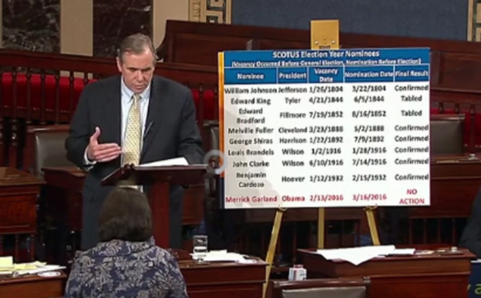 Merkley therefore didn't have a lot of patience for Republicans' contention that "the people" should decide whether a president in the last year of his term should be able to name someone to the Court, saying, "That is a phony, phony, incorrect, salacious, insert your own adjective there argument." We're not sure about "salacious," but what the hey, it's a talkathon, and for that matter, some R's probably did get a sexual thrill out of stealing a nomination from Barack Obama, because after all, he was Barack Obama.