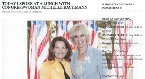 No, really, that's the entire blog post on Queen Birther and prominent California dentist-lawyer Orly Taitz's website. Just a clunky, ecstatic headline and an unformatted photo showing their outfits covered with mysterious white spots. (Bachmann is wearing the same outfit she wore with Sarah Palin! What does it mean? ) Did you know that Orly Taitz is running to become the next Condoleezza Rice, as California secretary of state? Oh, so you did. Hmm. Anyway, this is hopefully the last post ever about lawyer-dentist Orly Taitz. [ Orly Taitz , TPM ]