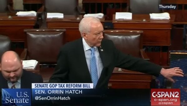 During Thursday night's debate on the tax bill, Hatch was pressed -- again! -- by Ohio Democrat Sherrod Brown to commit to reauthorizing CHIP, which expired at the end of September. Hatch insisted he really is committed to CHIP, oh heavens, yes of course: "Nobody believes more in the CHIP program than I, I invented it -- I was the one who wrote it. [Ted] Kennedy came over and became the one who helped put it through." But then Hatch went off on a tear about why reauthorizing CHIP is hard, what with money being short and all, for some reason: