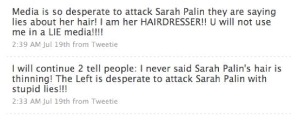 Anyhow, now Palin's hairdresser is speaking truth to power, via one million heavily punctuated Twitters. It's basically like what happened in Iran last month only better because this gal is not typing in Farsi.