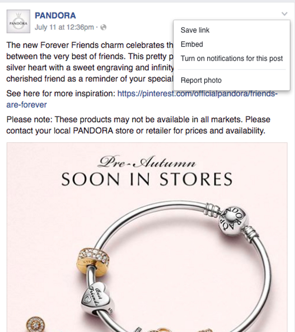 For instance, I am offended by the existence of those ugly ass Pandora charm bracelets. Say I were offended by their tackiness enough to "report" their Facebook posts as a crime against fashion -- I would click the left corner of the post and a little box would pop up with the option to report that post.