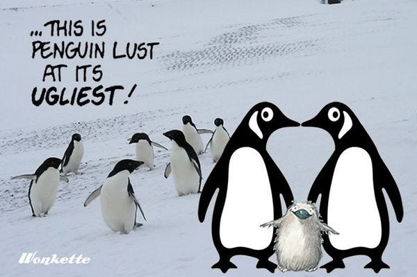 [ Popular Information / WaPo (gift link) / Photoshoop image by Wonkette,Background image by Eli Duke, Creative Commons License 2.0. Note: And Tango Makes Three is published by Little Simon, not by Penguin Random House.]