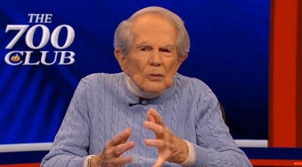 Once in a blue moon, everybody looks at each other and says "whoa!" because Pat Robertson says something that just utterly makes sense, or at least 50 percent makes sense. "Whoa!" they say, because they're not used to that from Pat Robertson, whose balls are 76,984 years old.