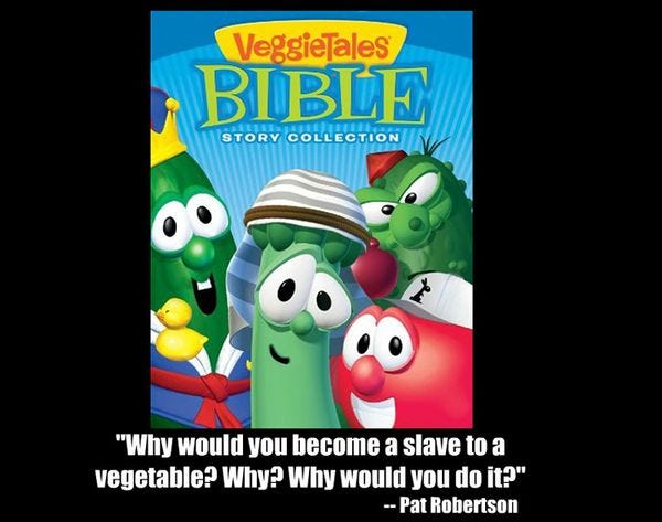 We do not know why we are slaves to vegetables, Pat. Maybe it's because our parents did not beat the veggie-smokin' out of us until we learned to love Jesus, as you have previously recommended. But pray continue: