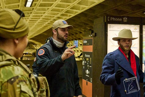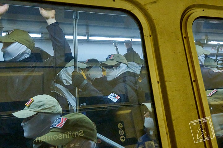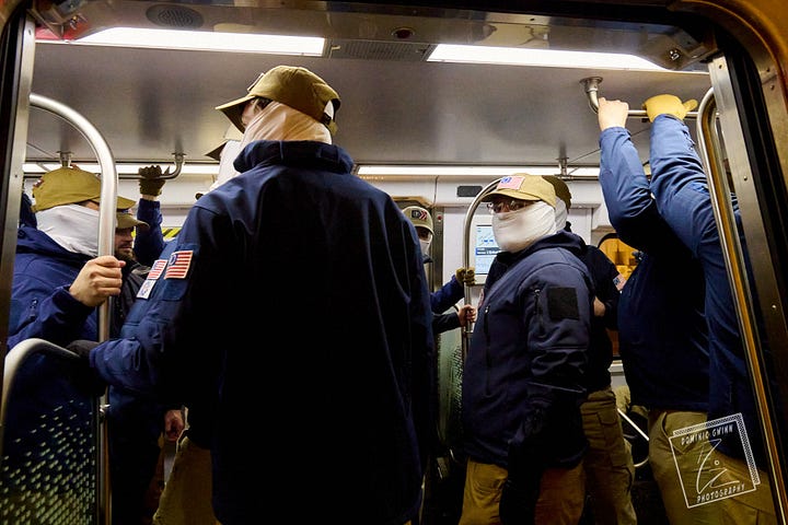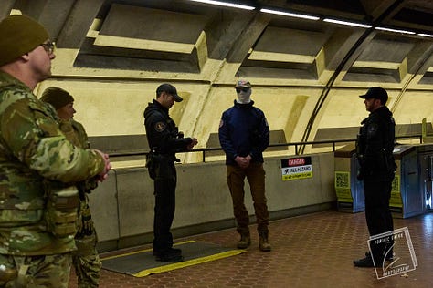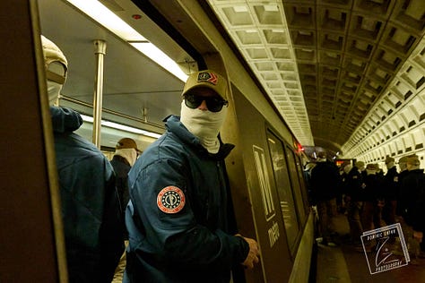 Various police forces and members of the National Guard, which is still on deployment throughout DC, stood by as the Special Police officer ID-ed the kid and informed him that he was not only being fined, but he’d still have to pay the fare. Rousseau and several other members of Patriot Front unmasked and began waving around a Metro SmarTrip fare card, apologizing and saying they could pay his fare. A few moments later, Rousseau informed the police and Guard that “his men” would be coming back up to the station mezzanine as they had gotten on the wrong side of the train platform.