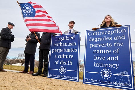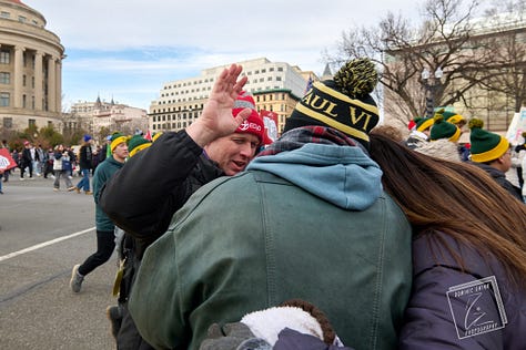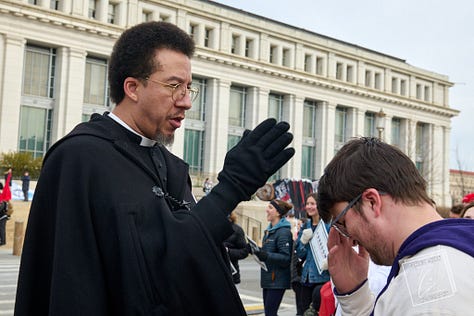 I could recognize a number of faces in the crowd. Fr. Calvin Robinson was there. A far-right British Brexiteer, he was booted from his congregation in Michigan last year over an alleged Nazi salute. He was greeting supporters and praying with them, and he did not like having his photo taken.