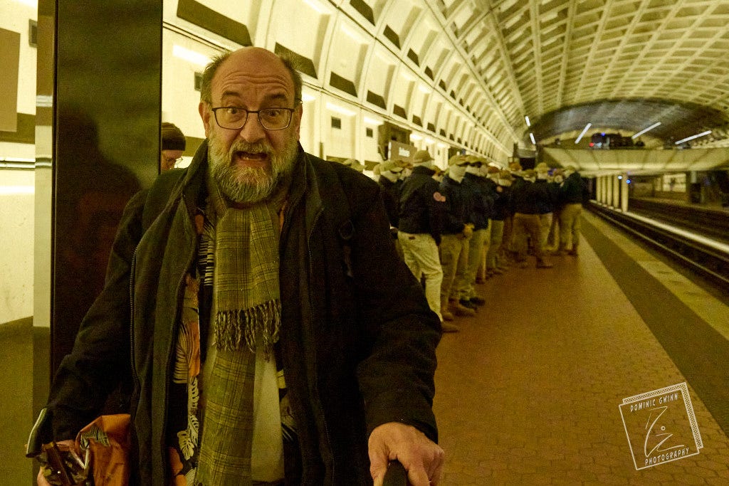 An elderly man who was sitting on a bench when they started massing around him got up and started walking to the far end of the platform. He walked up to me and and whispered, “Who the hell are these guys?”