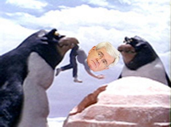 The number one greatest reason for Newt Gingrich to continue to fill up precious air time in the nation's collective unconscious is so we can still come across newswire ledes like this one: "At least one penguin at the St. Louis Zoo appears to be a feisty opponent of Newt Gingrich." This is great because we can then consider questions like, "Who has won, between the two opponents, the fat bird brain or the penguin?" and then chuckle to ourselves for asking silly questions in the first place.