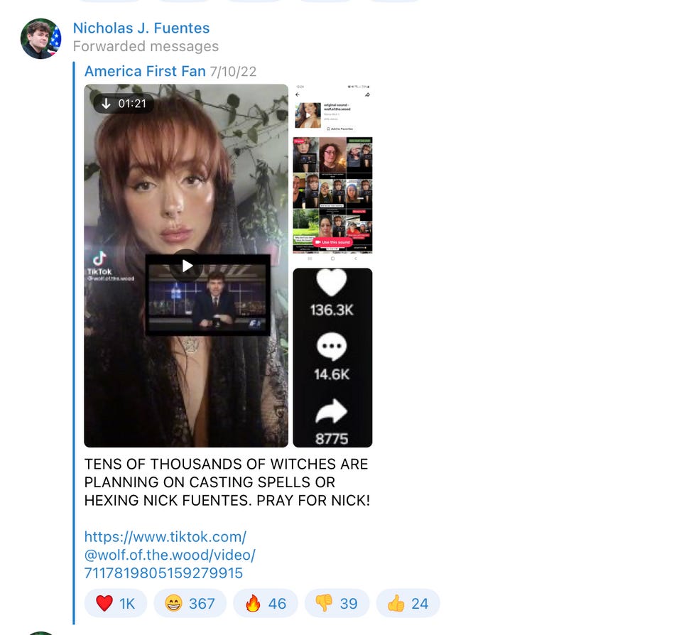 This also came up in a search for Chikken — an account called "America First Fan" that was asking people to pray for Fuentes due to all of the witches casting spells on him.