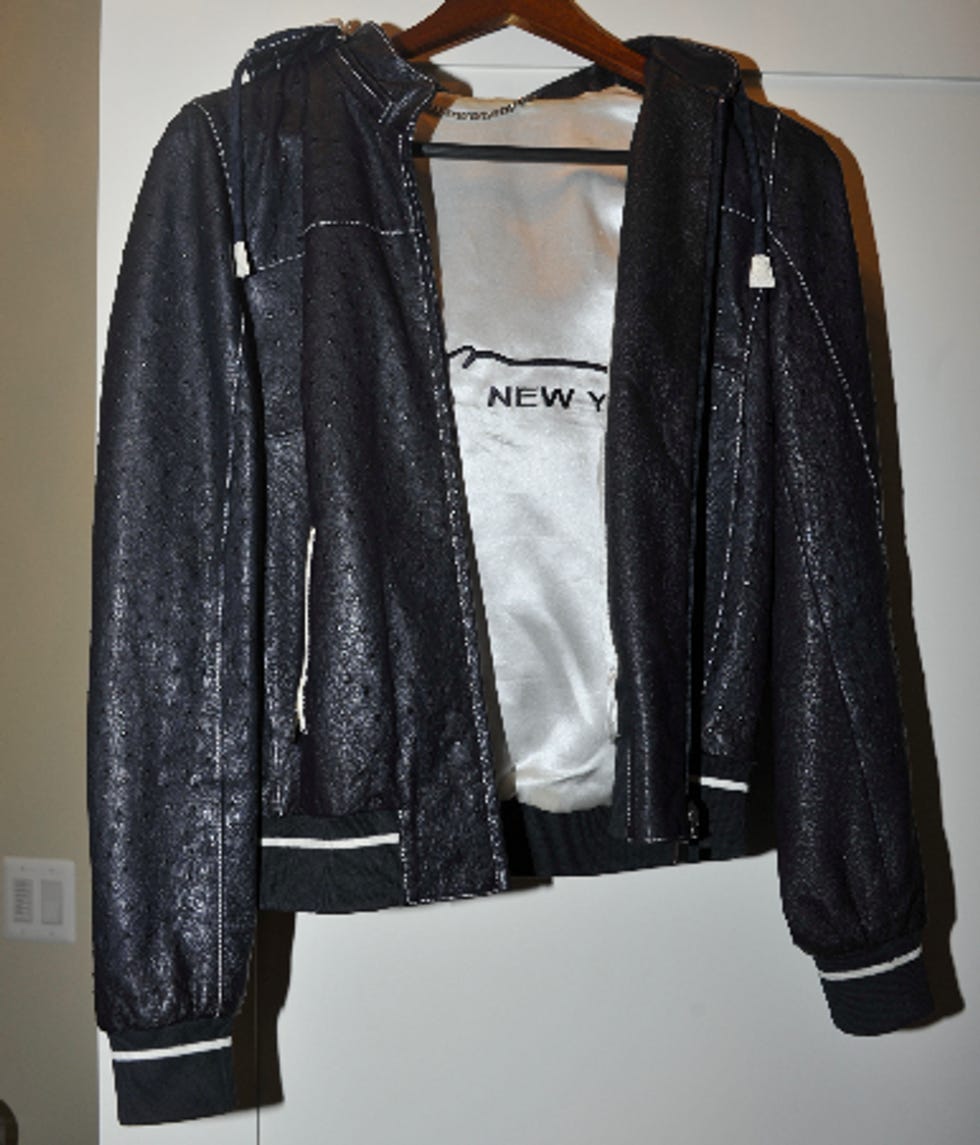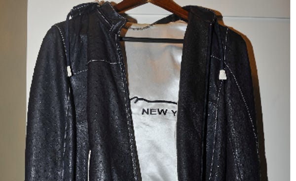 The big, special, fancy item everyone has been talking about is a $15,000 ostrich leather jacket from Alan Couture. Look at it, with your eyes.