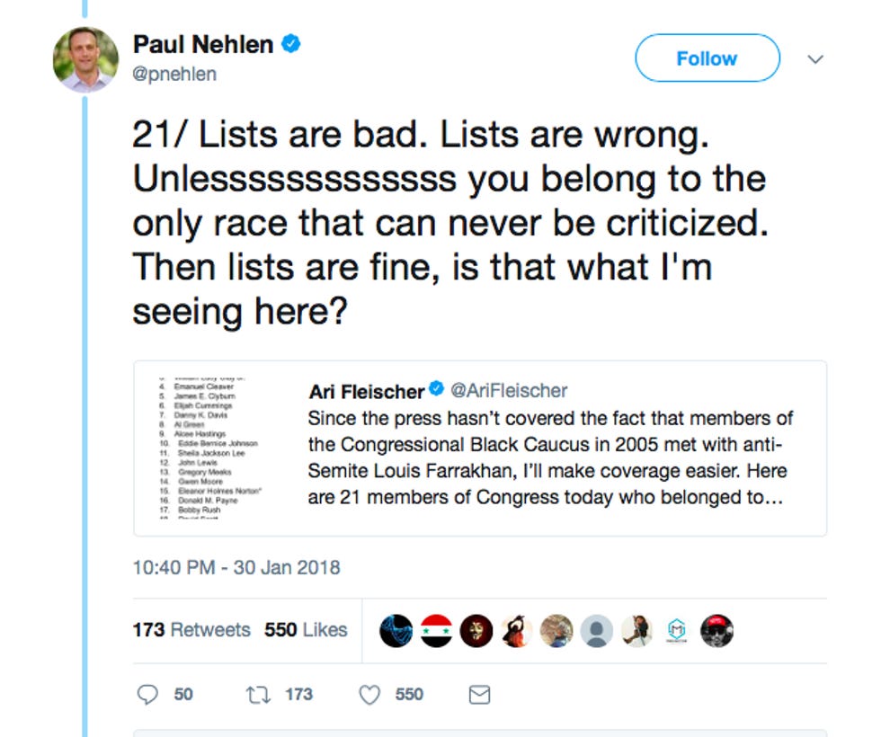 Later in the thread, Nehlen "called out" the Anti-Defamation League (ADL) for also having themselves made a list one time! A list of members of the Congressional Black Caucus who met with notable anti-Semite Louis Farrakhan!