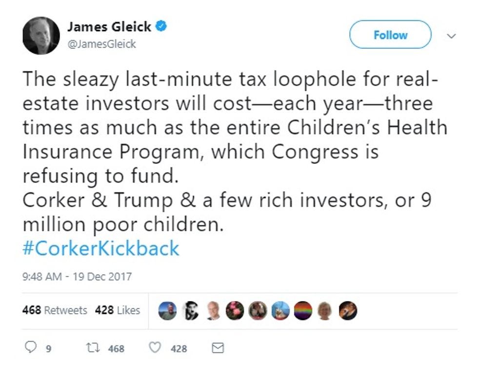 In one of the few unintentionally honest lines in the speech, Ryan said, "Yet for years now, the tax code has been skewed to the well-connected, full of special carveouts and loopholes." Mostly like the "Corker Kickback," that brand-new deduction for real-estate LLCs that will mean anextra millions in tax savings (on top of their tax rate decreases and alternative minimum tax abolishment and murder of the estate tax) for 14 of the GOP senators who'll be voting on the tax cut bill soon. And even bigger tax savings for Donald Trump.