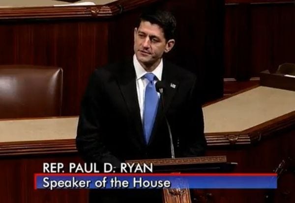 Paul Ryan took to the floor of the House today and gave a rousing speech in support of the big Republican Tax Cuts For Rich Fuckwads bill that passed shortly afterward. It was a bold souffle of trickle-down cant and outright lies, and you could practically hear old rich guys creaming their pants at every line of the thing. It was a truly sickmaking spectacle, and Ryan was peculiarly excited as he talked about the great days ahead of us, because "today -- today we are giving the people of this country their money back." We won't venture a guess at whether Ryan actually believes the bullshit coming out of his facehole about helping "hardworking Americans who have been left behind for too long," or if he knows he's lying and is delighted at the idea that the proles will buy it. Really, does it even matter? Let's just look at a few of Ryan's lies and not-quite-truths: